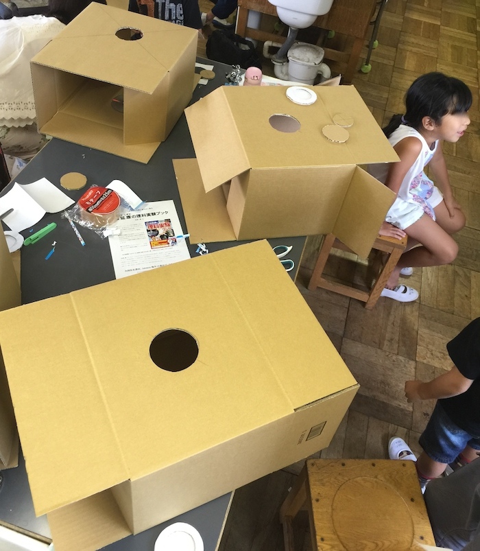 【工作】レインボーハンターはCDに反射させた太陽光をダンボールの中に投影する装置です。まずは、ダンボールを切ったり、穴をあけたり、紙をはったり。親子で協力しながら仕上げます。